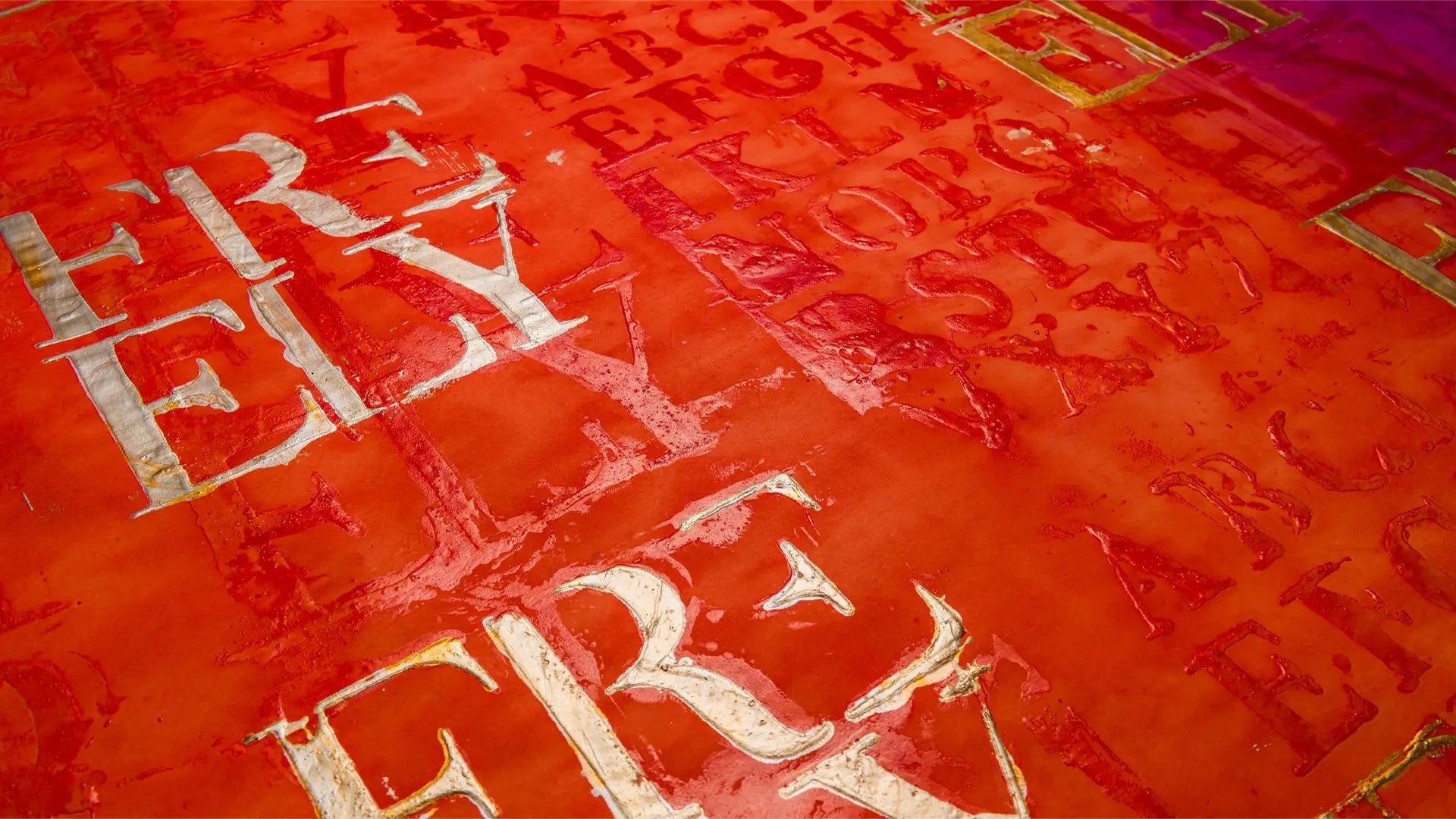 Il tratto distintivo delle opere di Enrico, siano esse tele o installazioni, è il carattere di stampa per eccellenza, il Bodoni, divenuto la cifra stilistica dell’artista, base per la creazione di un’originale e casuale “trama” visiva.